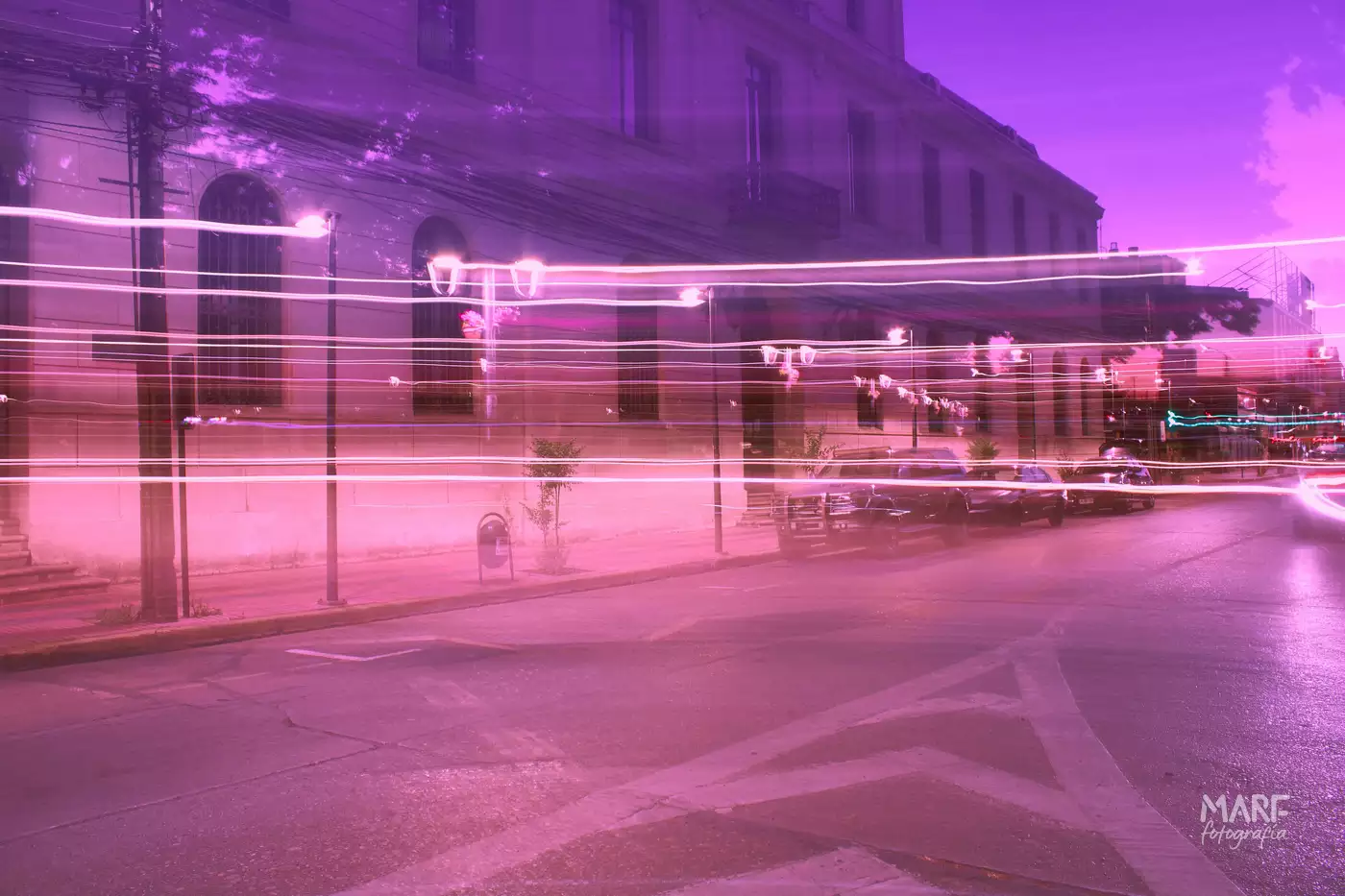 Recopilación de fotografías nocturnas de larga exposición en la plaza de armas de Linares, Maule, Chile, para Nocturx y Marf Fotografía