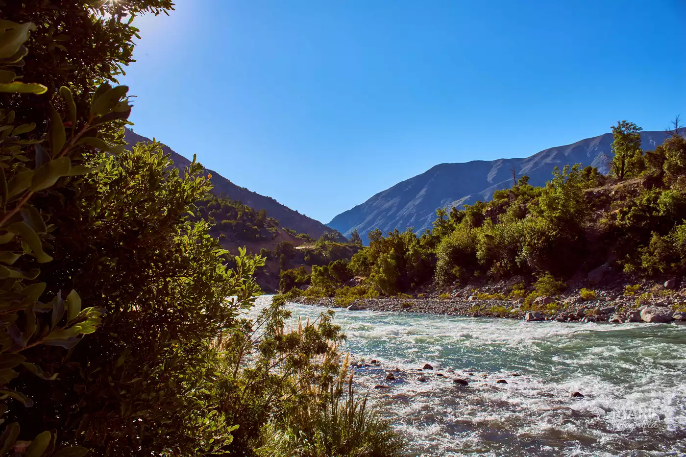 Por la ruta Ch-115, en medio de los Andes, siguiendo el río que da nombre a la región, y que da acceso al paso Pehuenche.